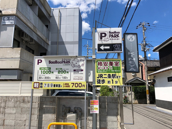 JR二条駅まで、すぐ。杵屋旅館隣の駐車場ですが、一日最大料金1000円と格安です。