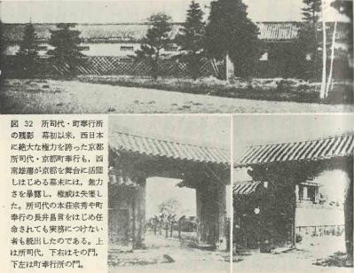 江戸幕府の職名。京都に駐在し,京都の警備,朝廷・公家(くげ)の監察,京都・伏見・奈良の町奉行の管理,近畿全域の訴訟の裁決,西国大名の監察などにあたった。1600年創設,1867年廃止。白壁・海鼠壁の多聞櫓(長屋)が取り巻いてるのが京都所司代の屋敷。そして、その下の右が同所司代の門、左が町奉行所の門。