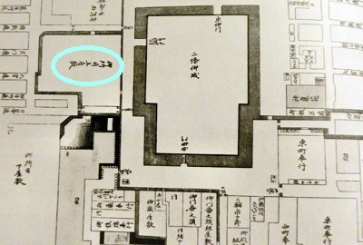 当時は文明開化で幕府の象徴的な建物など消したかったでしょうか、現在はなにも残っていません。二条城から歩いてすぐの場所にあり、古地図で見てみると青く囲んだ部分がこの石碑の場所にあたります